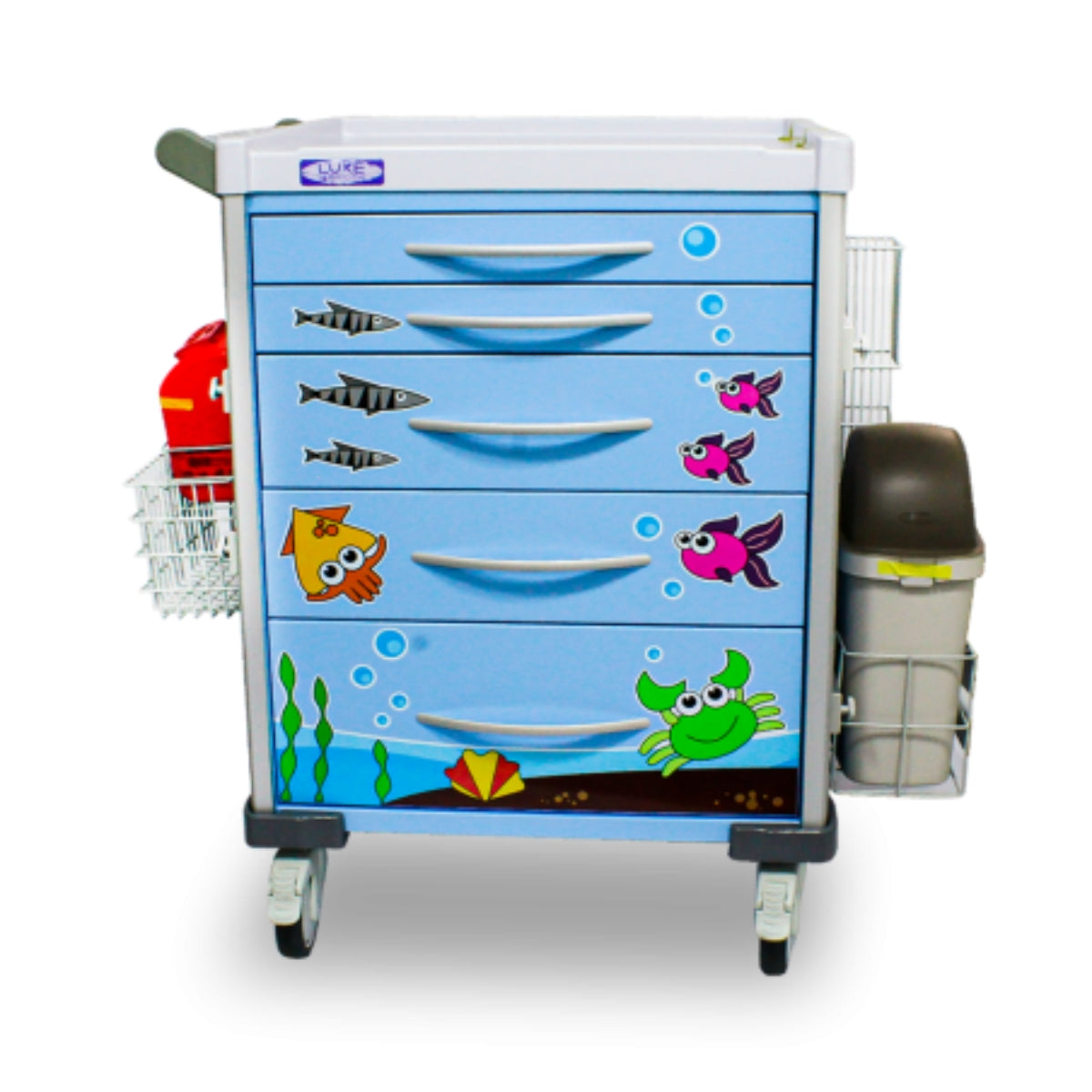 El Carro para Procedimientos Pediátricos combina funcionalidad y diseño infantil con motivos de peces, ideal para áreas pediátricas en hospitales. Ofrece estabilidad y movilidad gracias a sus ruedas TPR de 5" con freno y un sistema de seguridad central. Cuenta con cinco cajones de diferentes tamaños con rieles de aluminio y auto retorno para un acceso suave y seguro a medicamentos, accesorios y dispositivos médicos. Su superficie en PVC con ABS es removible para facilitar la limpieza, y su pasamanos de aluminio garantiza un manejo cómodo. Además, incluye accesorios prácticos como recolector de cortopunzantes y canecas para residuos.