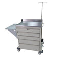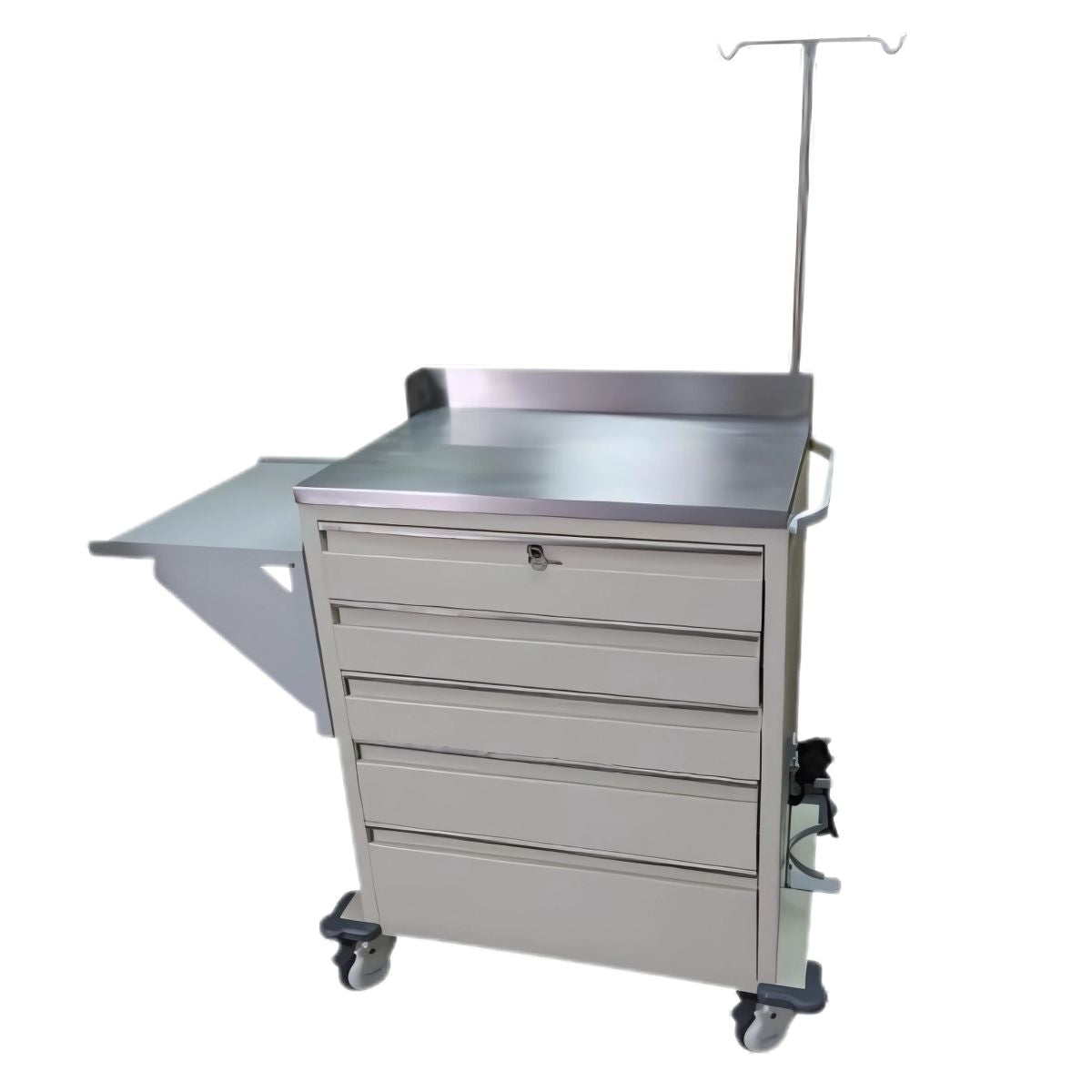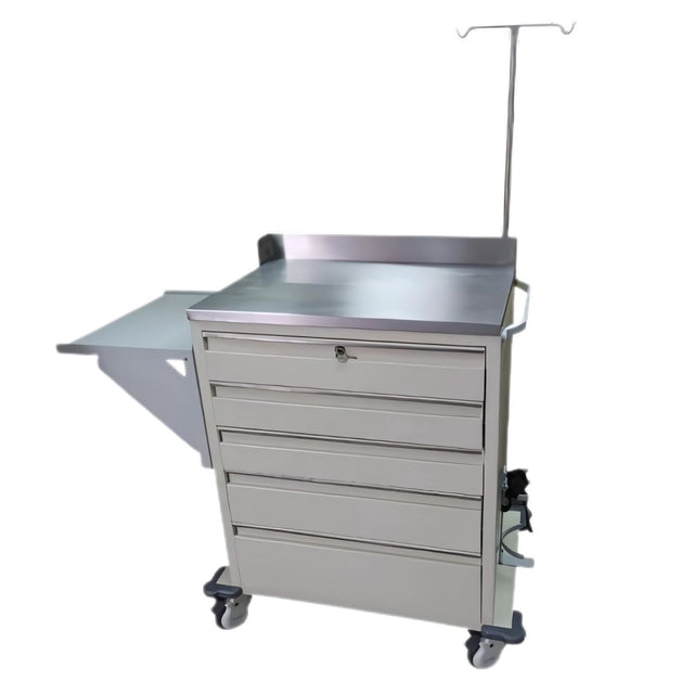 Carro de paro con cinco cajones, diseñado para emergencias médicas, ofreciendo almacenamiento eficiente y acceso rápido a equipo esencial en situaciones críticas.